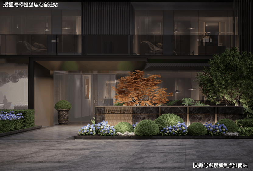 在社区门头上,采用麻省理工学院同款人文高定门头,上海少有的长约35⽶、高约5.1⽶酒店式迎归尺度,并引入价值不斐的名贵黑松、范思哲黑石材与茶色定制铝板,以秀于外隐于内的精神表达,给予每一位业主的尊贵仪式感。