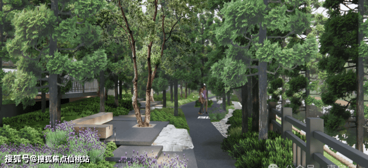 滨水活力轴是通过借景的形式,与水岸内外连通,两岸轴线分布滨水步道,植入了万物友好理念,可以承载散步、遛狗、休闲等户外生活。整体形成了香樟为口,水杉为墙的社区形态。