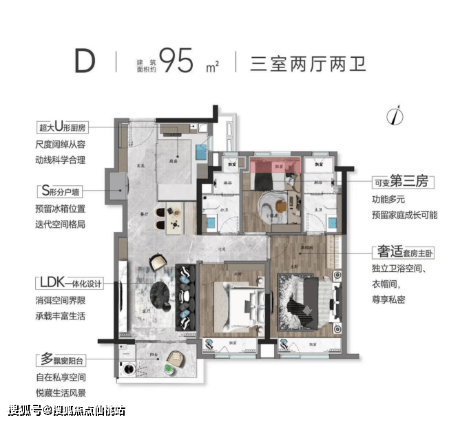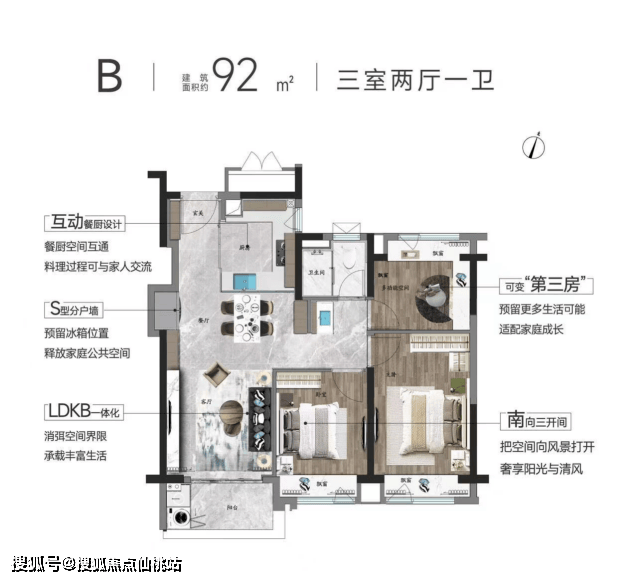 当需要实用性时,3房带来的实用性可以满足从一家三口到三代同堂的全生命周期需求。在加上可以放下双开门冰箱的S墙设计、全卧室带飘窗等户型优势。