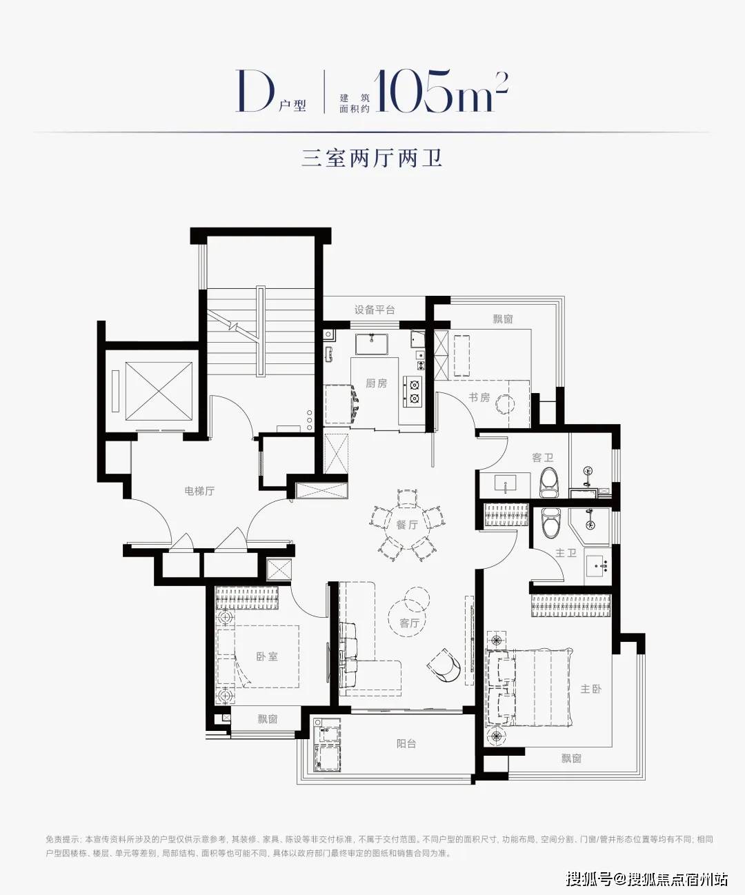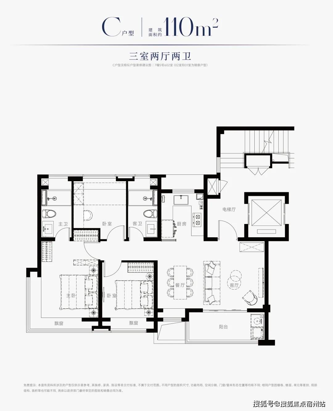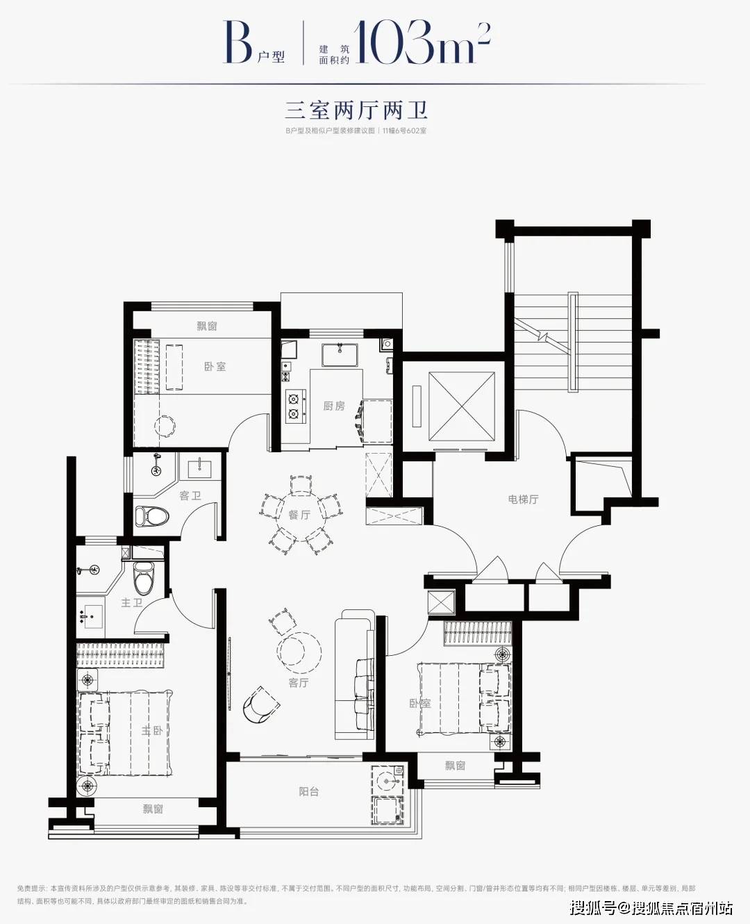 此户型在103㎡户型的基础上,将南向主卧、北向次卧均升级了约270°转角飘窗设计,采光视野及美观性都得到了极大提升。