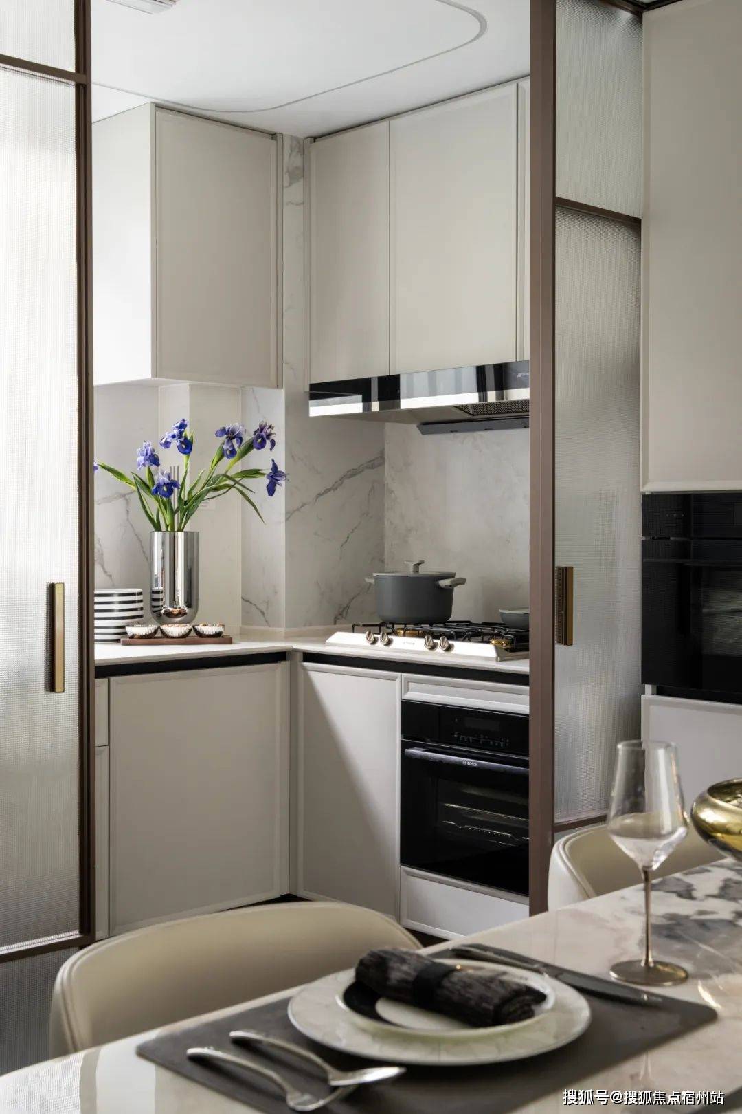 厨房方面,项目全系标配中西厨搭配,中间用无地面链条设计的海派金属玻璃移门隔开,使厨房地面与客厅打通,通铺的简一地砖,