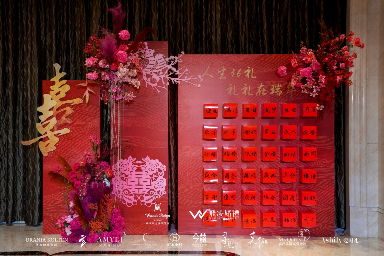 特设三十六礼区域,一面红墙之上,36个篆刻着诞生、满月、升学、订婚、成婚等人生节点的红盒整齐排列。从初生的喜悦到成家的圆满,中式礼仪的文化脉络被具象为可触摸的场景,让婚礼不再是单一仪式,更成为串联“人生重要时刻”的情感锚点。宾客驻足于此,既能读懂中式礼俗的温度,也能提前感知“从一人到一家”的幸福递进。