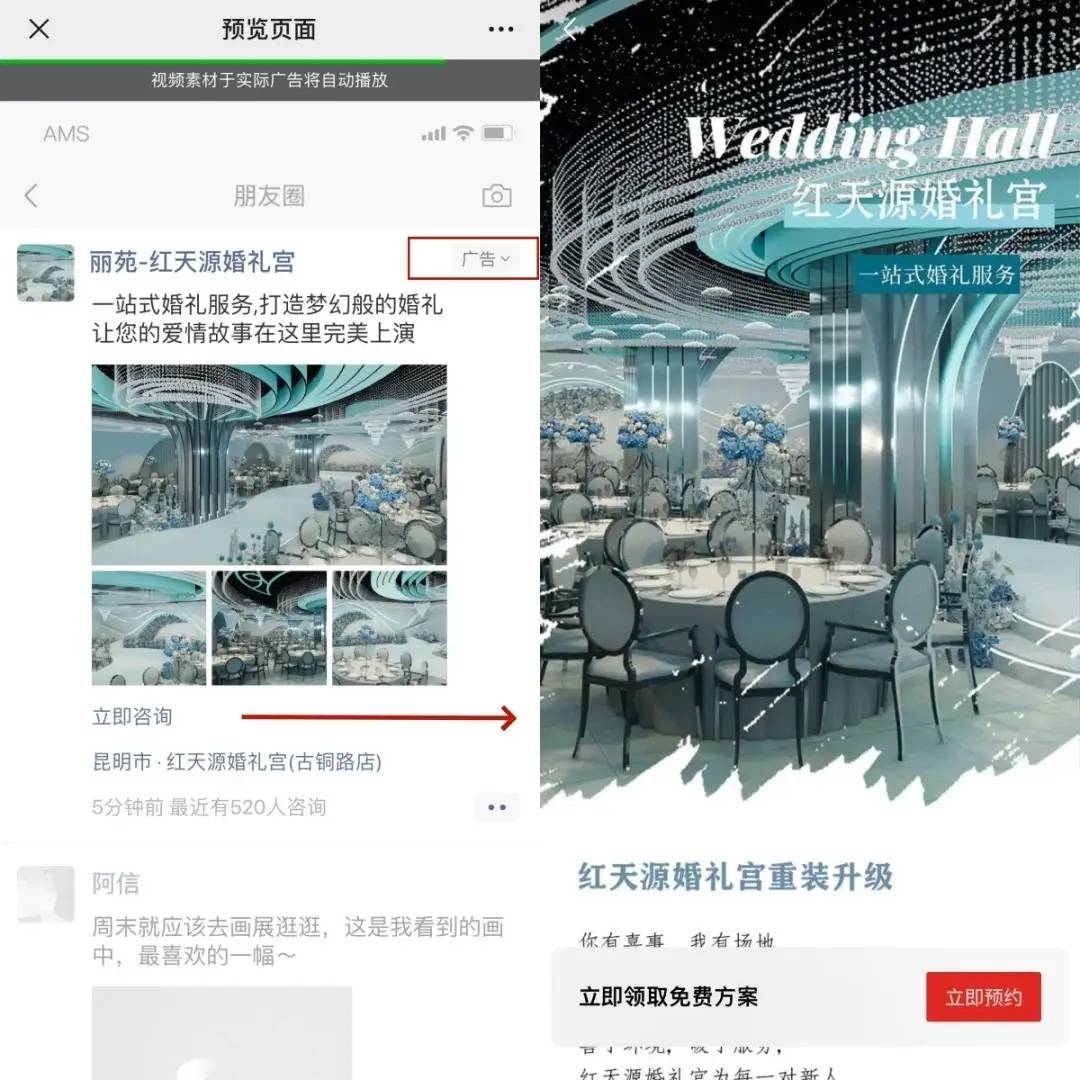 对婚宴酒店来说,它是年底旺季抢单的 “获客利器”—— 核心客群(25-35 岁准新人、双方父母)都是微信高频使用者;且年底婚宴档期紧张,广告能精准锁定本地及周边备婚人群,再通过场景氛围、菜品品质、性价比套餐激发预订意愿,转化效率远胜传统线下探店、婚庆公司推荐分成。