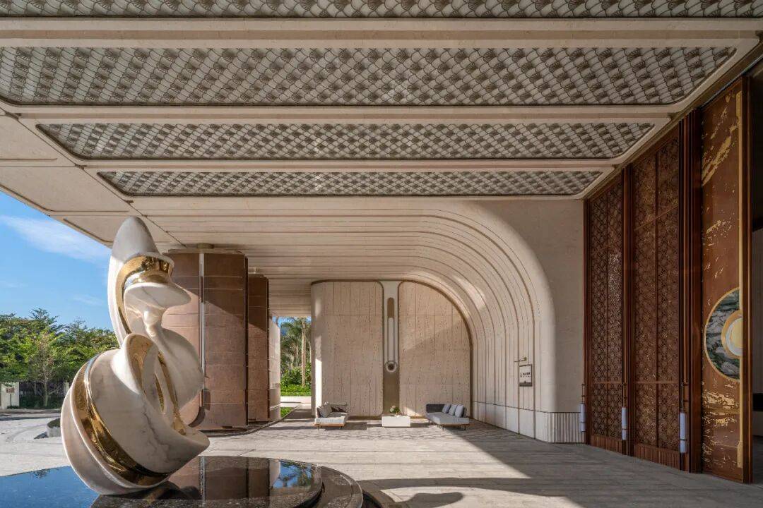 弧形水景倒映着贝金米黄石材立面的流光,汉白玉凤凰雕塑静立中央,非遗大师朱炳仁亲铸的铜门缓缓开启。