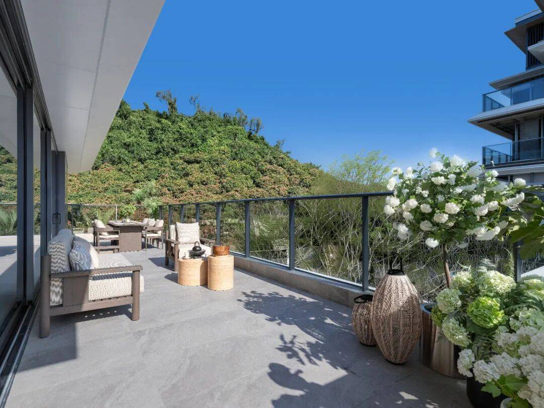 当你立于阳台,眼前景致层层递进:园景、湖景、山景等等,一幅生动的自然画卷在眼前从容铺展。