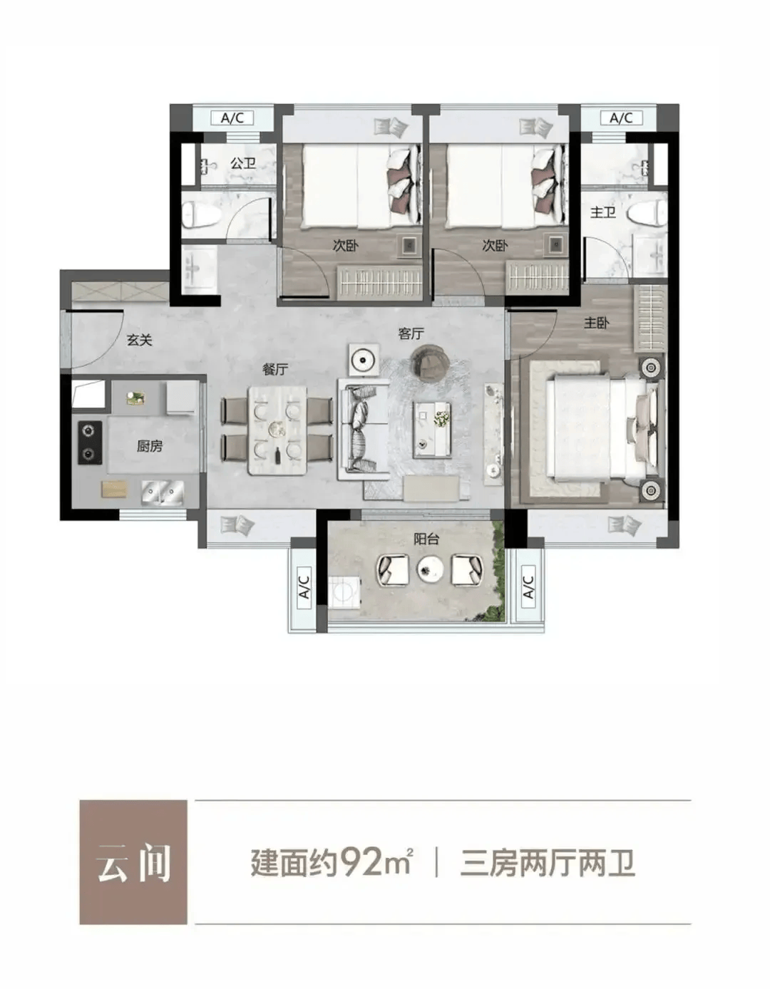 所有户型均为精装交付,配置中央空调、新风系统及品牌厨卫,装修标准高,质量有保障。交房后无需额外装修,拎包即可入住,既节省了时间和精力,又避免了装修带来的噪音和污染。